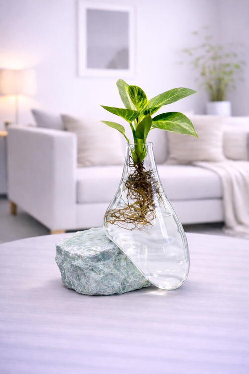 این گلدان خاص، ترکیبی هنرمندانه از شیشه دستساز و سنگ طبیعی است که جلوهای مینیمال و در عین حال لوکس به فضا میدهد. شیشهی شفاف با فرمی ارگانیک، بهنرمی روی سنگ قرار گرفته و حالتی شبیه جاری شدن آب روی صخره را تداعی میکند. گیاه بهصورت هیدروپونیک (در آب) نگهداری میشود و ریشهها بهوضوح از داخل شیشه دیده میشوند؛ جزئیاتی زنده که حس طبیعت را وارد دکوراسیون داخلی میکند.