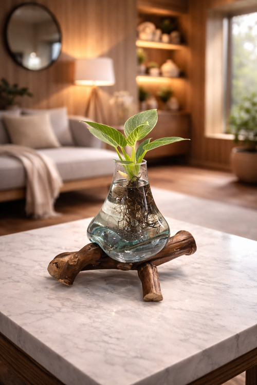 این گلدان دکوراتیو با ترکیب شیشه شفاف دستساز و چوب طبیعی، یک انتخاب خاص برای فضاهای مینیمال و مدرن است. طراحی ارگانیک آن باعث میشود هر قطعه کاملاً منحصربهفرد باشد و جلوهای گرم و طبیعی به دکوراسیون منزل یا محل کار شما ببخشد.