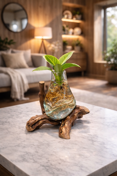 این گلدان دکوری شیشهای با طراحی خاص هیدروپونیک، ترکیبی چشمنواز از شیشه شفاف دستساز و پایهی چوب طبیعی است. فرم ارگانیک شیشه در کنار چوب طبیعی، حس طبیعت و آرامش را به فضای خانه یا محل کار میآورد. ریشههای گیاه در آب کاملاً قابل مشاهده هستند و جلوهای مدرن و مینیمال ایجاد میکنند. هر گلدان بهصورت خاص و غیرتکراری ساخته شده و مناسب دکوراسیون مدرن، بوهو و طبیعتگرا است.