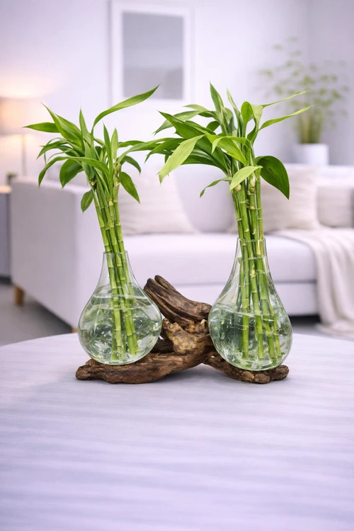 ⚠️ توجه: این محصول شامل گلدان شیشهای و پایه چوبی است و بامبو یا گیاه همراه آن ارسال نمیشود.