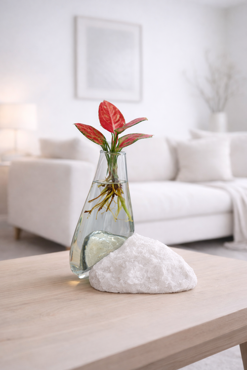 گلدان شیشهای دستساز با سنگ نمک سفید طبیعی، الهامگرفته از دل طبیعت. ترکیبی آرامشبخش برای دکوراسیون مینیمال منزل. هر گلدان تکنسخه و خاص است