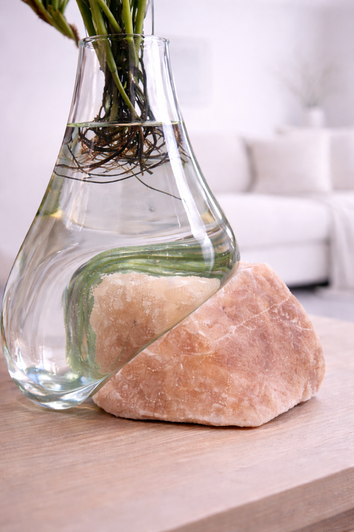 گلدان دکوری شیشهای با پایه سنگ نمک صورتی طبیعی، ترکیبی آرامشبخش و خاص برای دکوراسیون منزل و محل کار. هر گلدان تکنسخه و منحصربهفرد است