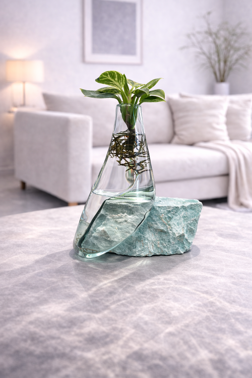 این گلدان ترکیبی هنرمندانه از شیشه شفاف دستساز و پایهای از سنگ طبیعی با طیف سبزآبی ملایم است که در کنار گیاه، جلوهای آرام و زنده به فضا میبخشد. شفافیت شیشه، ریشههای گیاه را به بخشی از زیبایی بصری تبدیل کرده و ارتباطی مستقیم با طبیعت ایجاد میکند. پایه سنگی با رنگ سبزآبی الهامگرفته از عناصر طبیعی، حس خنکی، تعادل و مینیمالیسم را به دکوراسیون اضافه میکند. این گلدان انتخابی خاص برای فضاهای مدرن، مینیمال و دکورهای الهامگرفته از طبیعت است؛ مناسب میز، شلف یا گوشهای دنج برای نفس تازهی خانه یا محل کار