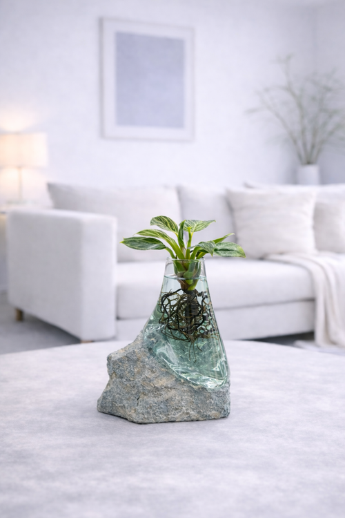 گلدان شیشهای دستساز با پایه سنگ طبیعی سبزآبی، طراحی مینیمال و مدرن، مناسب دکوراسیون خاص، نگهداری آسان و جلوهای الهامگرفته از طبیعت