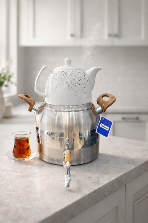 قوری سرامیکی قرارگرفته روی کتری، حرارت را بهخوبی حفظ کرده و طعم طبیعی چای را ماندگار میکند. طراحی دستههای چوبی، علاوه بر زیبایی، استفادهای ایمن و راحت را فراهم میسازد. شیر خروجی روان و خوشساخت نیز سرو چای را سریع و بدون چکه انجام میدهد.