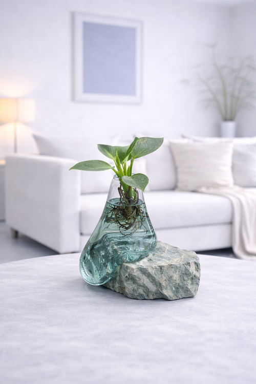 این گلدون شیشهای خاص، روایتی آرام از پیوند طبیعت و طراحی مدرن است. شیشهی شفاف و دستساز، ریشههای زندهی گیاه را به زیبایی نمایان میکند و در کنار سنگ طبیعی، حس تعادل، سادگی و اصالت را به فضا میآورد.