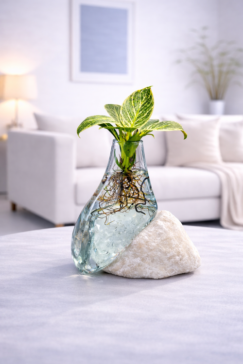 این گلدان دکوری شیشهای دستساز، ترکیبی هنری از شیشه شفاف با فرم ارگانیک و سنگ طبیعی است که جلوهای مینیمال و خاص به فضای منزل یا محل کار میبخشد. طراحی نامتقارن گلدان در کنار سنگ طبیعی، آن را به یک المان دکوراتیو مدرن و چشمنواز تبدیل کرده است.