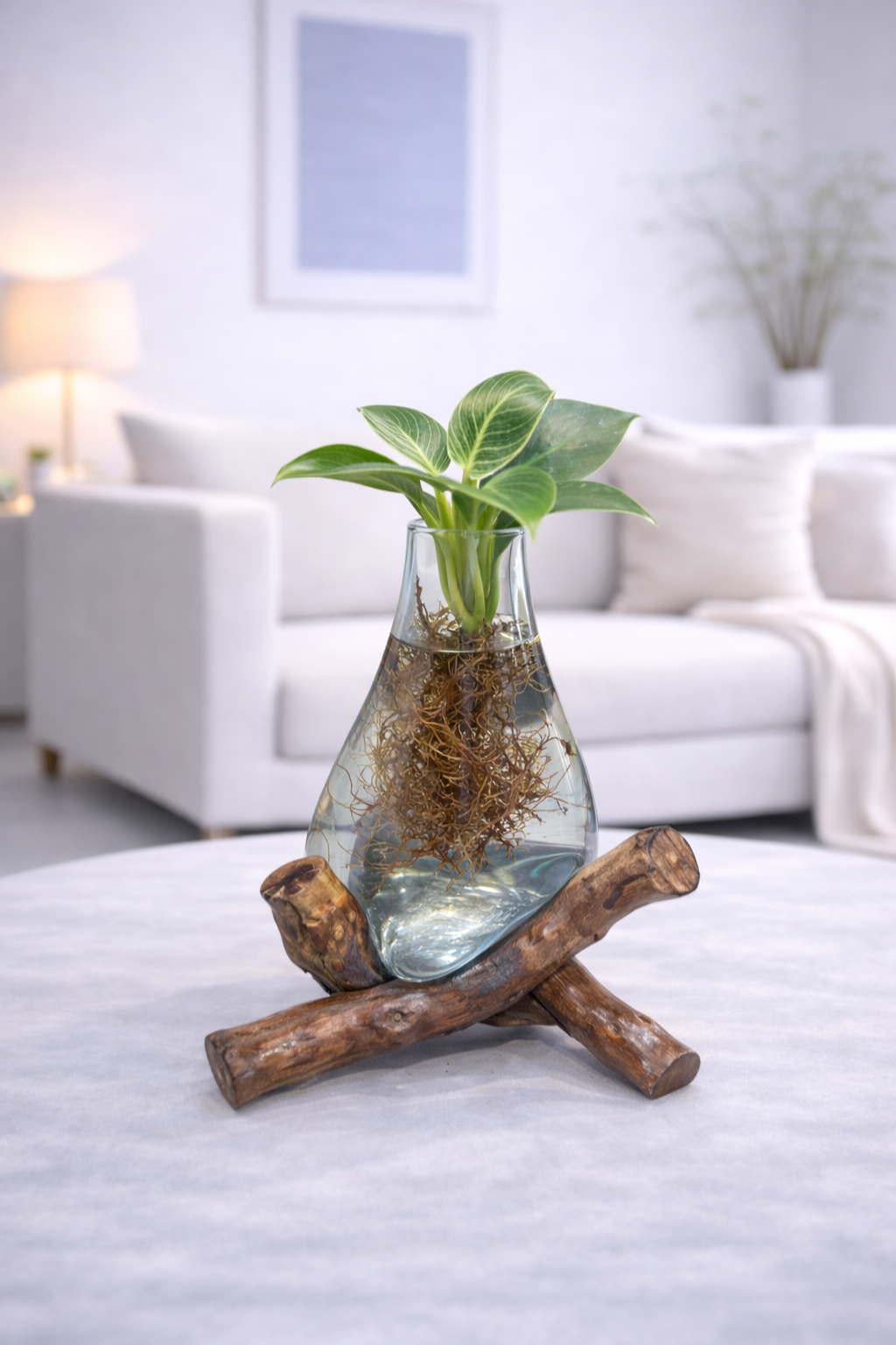 این مدل مناسب دکوراسیون منزل، محیط کار، میز پذیرش یا ویترین فروشگاهی است و برای گیاهان مناسب آبکاشت (هیدروپونیک) طراحی شده است. شفافیت شیشه، ریشه گیاه را بهزیبایی نمایش میدهد و حس طبیعت زنده را به محیط منتقل میکند.